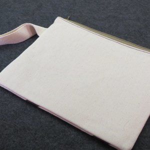 Handmade from linen colored denim with ribbon detail and zippered closure with cotton twill wrist strap