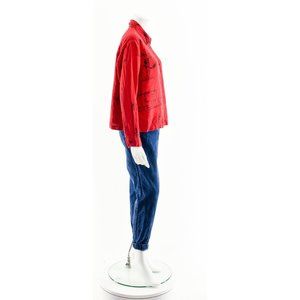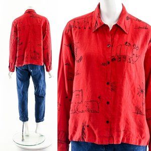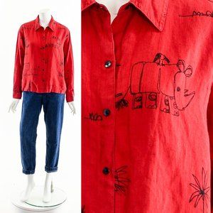 Animal Safari Top,Red Linen Blouse,Vintage Linen Jacket,Elephant Tiger Blouse,Zo