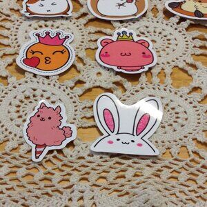 12 new peel-off stickers featuring cute animals (hamsters, a tiger, a bunny plus a dog bowl and a couple of funny heads . Can use on cellphones, lockers, laptops, beverage bottles like hydroflask, computers, crafts projects, scrapbooking.