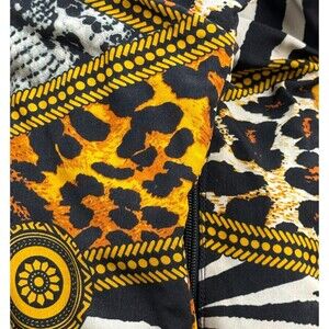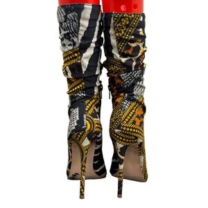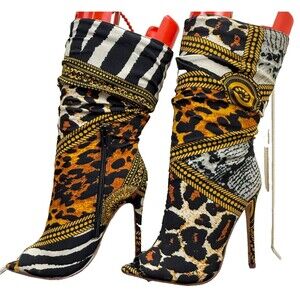 Statement stiletto booties in size 6. Shades of gold, black, white, and brown bold slouchy fabric boots. Animal patchwork pattern of leopard, zebra, and snakeskin with gold chain and medallion print accents make these eye-catching boots stand out. Ultra high 4.5-inch heels, mid-calf length, and pointed peep toe add to the edgy glamour. Lined interior with padding, arch support, and zip close allow for function and style. Express personal style at the club or in the boardroom.