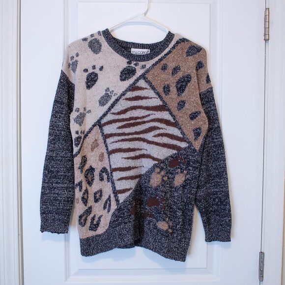 Bold 80s-style sweater with a mix of animal print blocks—zebra, leopard, and cheetah—all blended into an eye-catching geometric layout. Features a luxe silk, angora, and wool blend in warm neutral tones with slight sparkle in the thread. Great for lovers of eclectic vintage, maximalist style, and cozy fall fashion.