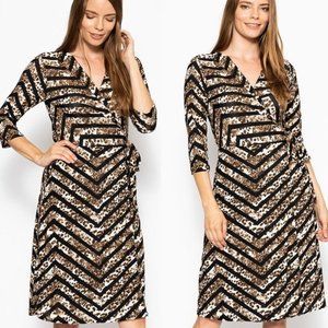 Print midi, a-line dress in a relaxed fit with a v-neck, wrapped style, side waist tie, and short sleeves.