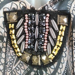 Beaded center of black rhinestones, pink pearls, and brass, bronze and gunmetal