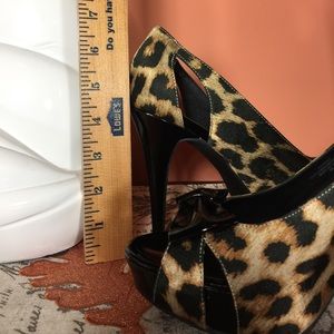 Guess, animal print shoe. 4.5" heel. Textile/man made upper size 8. Patten leather heel, toe & bow. Heel has minor wear see pics. Great with fitted jeans or blk mini. Make it your own.