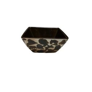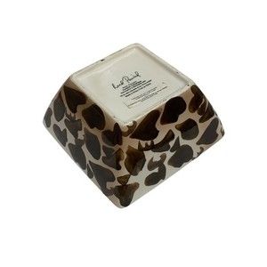 Very cute animal print dip dish. This dish is square with a brown interior and brown spots on a cream background. This bowl is handpainted and measures 6 1/4 x 6 1/4 x 3.