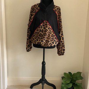Brand new - never worn. A retro jacket with the right fit and flair. Terez Leopard Goals Windbreaker protects you from the elements—and looks good doing it, too! Red piping, black accents, and a hyper-realistic print make a bold statement wherever you go, while the cuffed wrists and waist add protection and insulation.