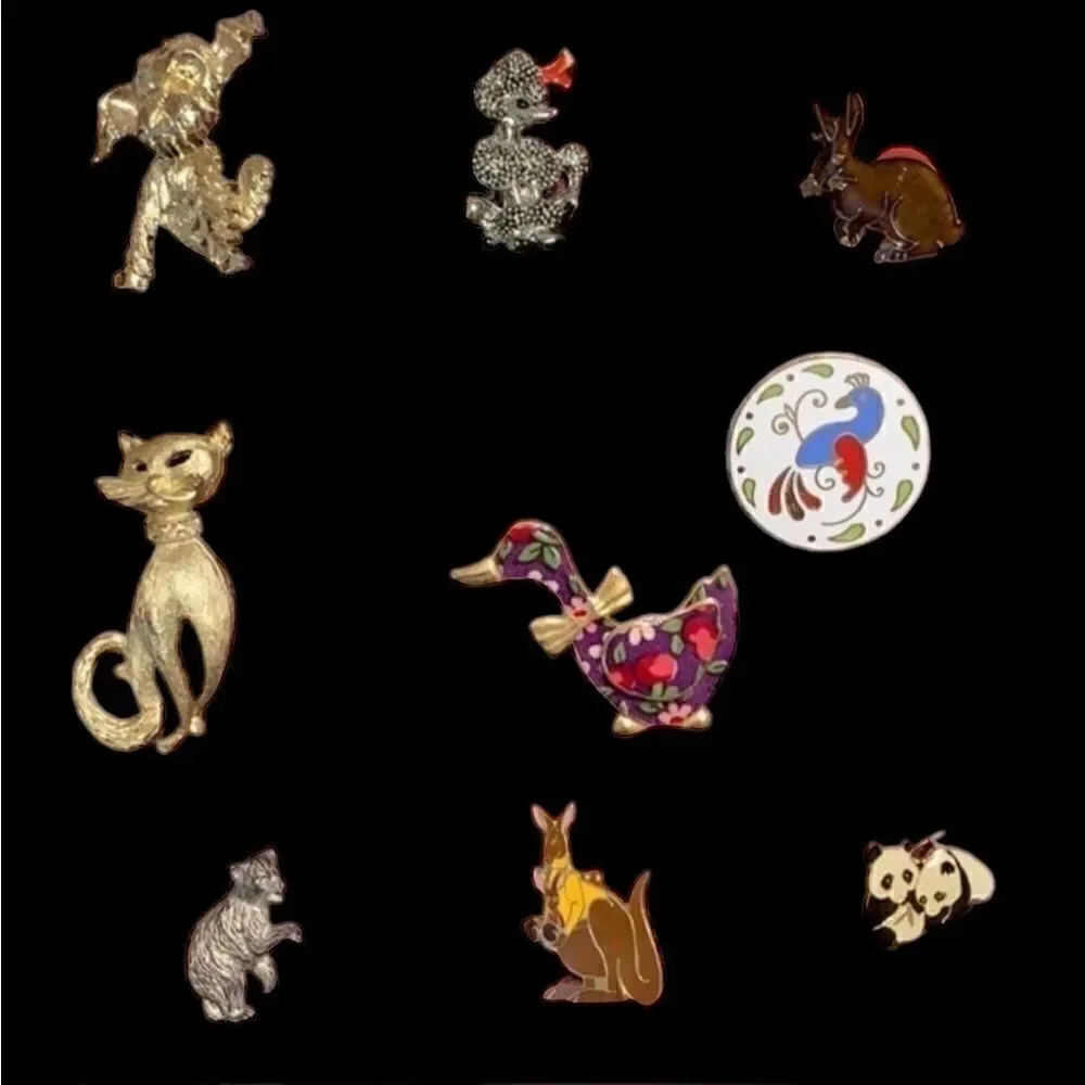 Assortment of 9 different badges. pins. All animal themed. All have fasteners that work. All good condition