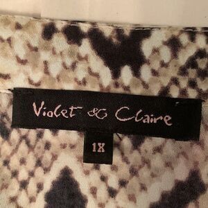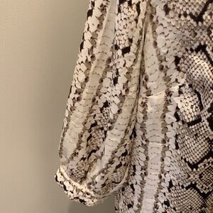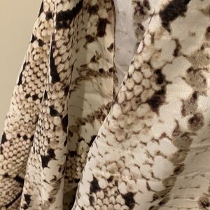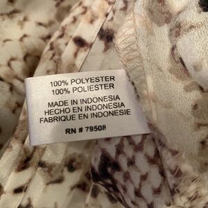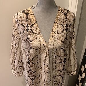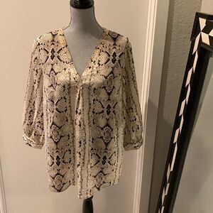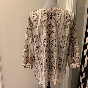 This lightweight tunic is tan, ivory and brown. It has an animal print. V-neck. 3/4 sleeves. Lightweight with a silk look. Underarm flat across is 22”. Length is 29”. Excellent condition.