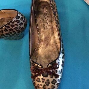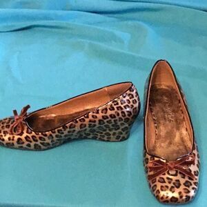 Super cute little shoes in an animal print design with a small wedge heel. NWOT. Has a small velvet bow at toe. Anti skid sole. Measurements are as follows: heel 1 1/2”, widest part of sole 3 1/3”, inside length 8 3/4”