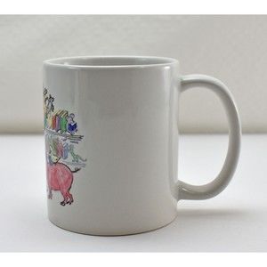 Perfect gift for book lovers, librarians and teachers. White mug with colorful drawing of animals (giraffe, duck, turtle and mice) reading books with bookshelf in background. No markings, just partial price sticker on the bottom. Coffee cup measures 3-1/4" across the top and the bottom, and is 3-3/4" high.