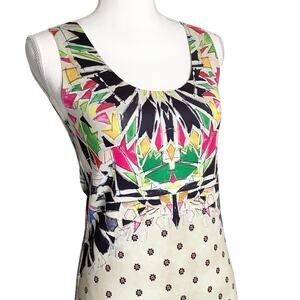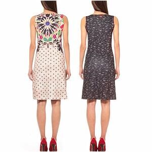 A-line reversible tank dress with one side black with a fish print and the other side a multicolor abstract print over watercolor dyed design.