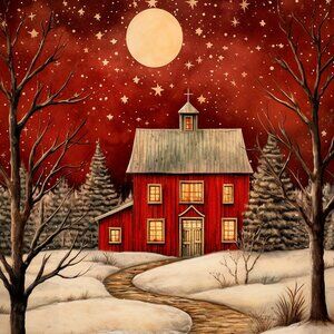 Adorable collection of folk art depicting farmhouse or barn in a snowy landscape. Bold colors.