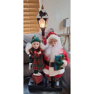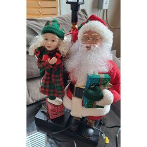 ☆ DESCRIPTION – Animated electric (wall plug-in and switch powered) Santa & Little girl standing in front of a 36” telescopic lamppost. Both figures move side to side (see videos) The little girl has blonde hair and is standing on wrapped presents next to a jolly looking Santa who is holding a wrapped gift. The lamppost has a green wreath with a red box hanging from it.