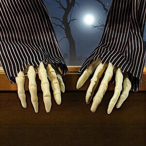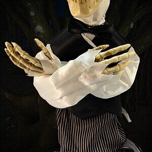 Animatronic Halloween Skeleton with Top Hat and Red Glowing Eyes is a spooky and festive addition to your Halloween decor. Standing at 15 inches tall, this animatronic skeleton is made of plastic, metal, and fabric materials. The top hat and red glowing eyes add an extra element of fun and whimsy to this Halloween collectible from Home Accents Holiday. Made in China, this unique prop is sure to delight and entertain guests during Halloween festivities. In Good Condition No Brakes, Cracks or Stains Tested and Works Great. Made Video but it won't format.