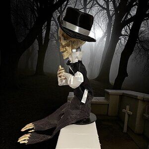 Animatronic Halloween Skeleton With Top Hat And Red Glowing Eyes 15" Tall Sittn'