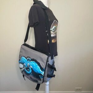 Anime Bleach shoulder bag, messenger bag, computer bag, tote. I believe the character is Hitsugaya Toshiro. Large exterior and interior zippered pockets. Gray cotton canvas exterior, black fabric lining - very clean. Adjustable shoulder strap. See video for signs of wear on front. Approximate measurements: 15” wide x 14” tall x 5” deep. Good condition.