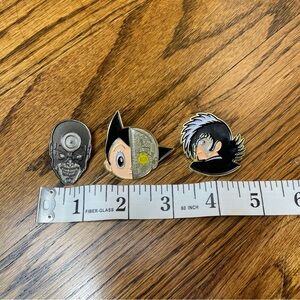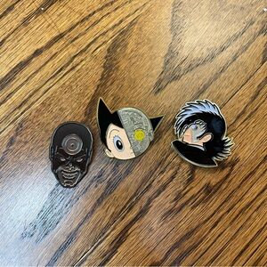 Set of three anime character enamel pins. Features black, gold, and tan colors. Perfect for collectors and fans.