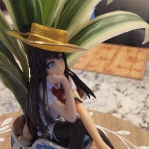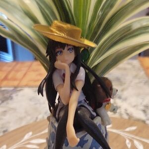This figurine features a highly detailed anime-style girl with long dark hair and a gold-colored straw hat, casually perched on a decorative shoe.