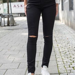 Black Skinny Mid-Rise w/Raw Edge hem. These don't have much stretch to them, but are a true Size 28 fit and have good length. I bought two different sizes on Black Friday sale, and like the other size better on me. These are brand new out of the box, tried on once. Originally $199 so this is a great steal!