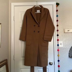 Stylish tan wool and cashmere coat by Anine Bing. Features a classic design with large pockets and button closure. Perfect for layering.