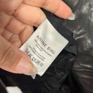 Crafted from genuine leather, this Anine Bing jacket features a sleek, fitted silhouette with a cropped length and a classic moto-style design. The deep black color and silver-toned hardware add a touch of sophistication to its edgy aesthetic.