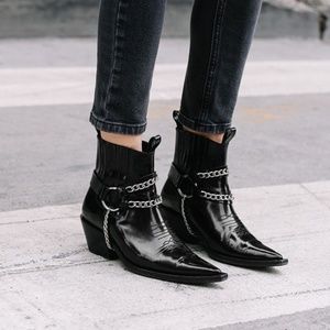 Never worn and absolutely stunning boots! High quality and just gorgeous. Heel 2.5 high -I got as a gift for Xmas- and I have a pair that are similar! I LOVE these. Tried them on once and super comfortable. Real patent leather. Rock and boho style pull on.