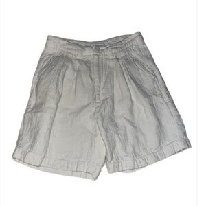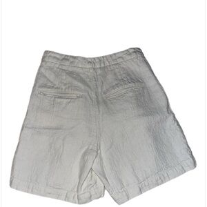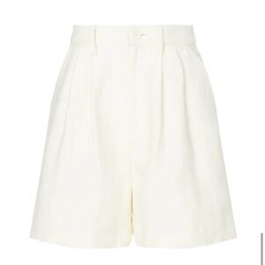 The Carrie Short is a pleated, trouser-inspired bottom made from midweight cotton canvas in ecru white. This tailored style is fully lined and features five functional belt loops, two back welt pockets, slanted front pockets, and a zip-front closure with a gold engraved button.