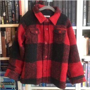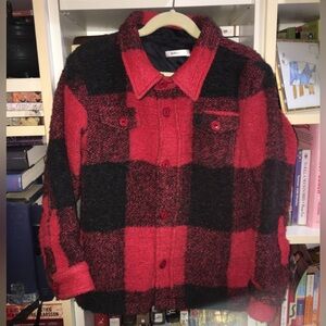 Stylish red and black plaid jacket for kids. Perfect for a trendy look. Anine Bing red and black Buffalo check plaid coat. Matching red buttons with pockets on the chest. Textured fuzzy fabric. Unisex size 8 / 10. No unisex sizing category on here. Perfect for boys or girls. Would look great on a trip to the farm or apple picking. The Bing Kids line is no longer made so these are no longer in production