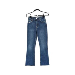 Anine Bing Mid Indigo Lara High Waisted Contrast Topstitching Hidden Five Button Closure Classic Five Pocket Styling Grinding on Front Back Pocket Edges Raw Hem Subtle Flare Jeans Stretch Ankle Denim Size 27 - Excellent condition.