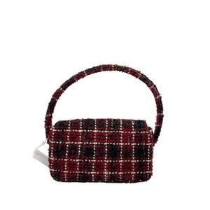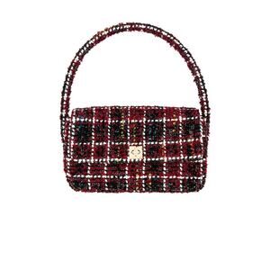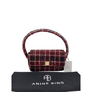 Anine Bing 'Nico' Red Wool Bag: plaid check pattern, single shoulder strap, foldover top, gold-tone hardware, clasp fastening, internal zip-fastening pocket.