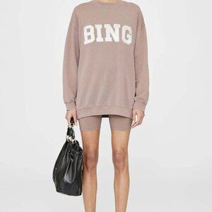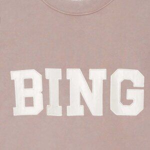 The Tyler Sweatshirt Satin Bing is an oversized crewneck pullover made from midweight 100% organic cotton fleece in washed iron. It features a satin patch graphic in ivory collegiate lettering at the chest, rounding out its athletic-inspired look. This style is finished with ribbed trim at the collar, cuffs, and hem.
