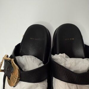 The sleek and best-selling Waylon Slides by Anine Bing. Made from smooth black leather with signature gold western-style buckles—timeless, chic, and versatile. A celebrity favorite (yes, even seen on Taylor Swift 👀).