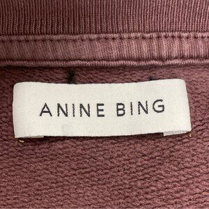 Anine Bing Women's Pink Organic Cotton Ombre Sweatshirt M Graphic Casual Crewneck. Made from 100% organic cotton, this medium-sized sweatshirt features a trendy ombre gradient from light pink to mauve with "Anine Bing" printed across the front in bold yellow lettering. Designed with dropped shoulders and ribbed cuffs, it ensures both a stylish and comfortable fit. Machine washable, made in Turkey.