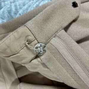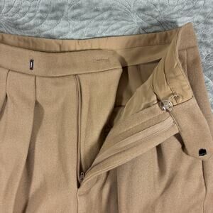 Anine Bing pleated wool pants, camel brown color. French size 38, US size 4. Warm and well made. Lining is polyester. Pockets. Light academia style for the office. Very good preowned condition. The inner button is loose, see photos. Dry clean only. No stretch, very structured. Minimalist or capsule piece, elevated basic.