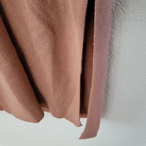 The Zoey Dress in camel is a lightweight sweater dress constructed from a soft modal rib-yarn fabrication with vertical rib-stitch texture, making it an ideal choice for cold-weather layering. This versatile midi-length dress features a high crew neckline, dropped shoulders that extend into long relaxed sleeves, and a slit at each side seam.