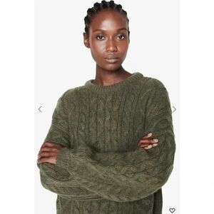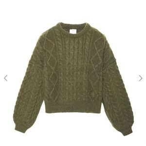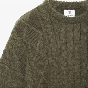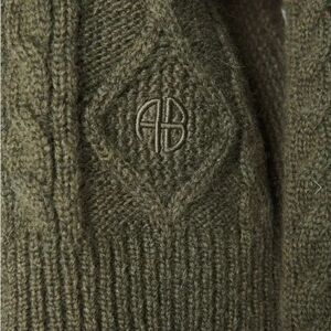 The Irina Sweater is a heavyweight cable-stitch knit made from a luxurious alpaca wool yarn in a neutral shade of olive green. A capsule wardrobe essential, this chunky sweater features a subtle embroidered ANINE BING monogram at the wearer's front for added detail.