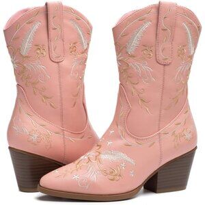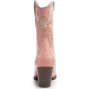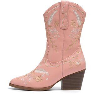 Anjoufemme Mid-Calf Booot Women Pink Polyurethane Embroidered Round-toe