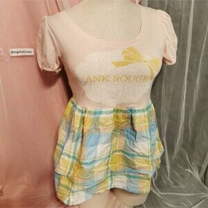Ank Rouge Japan import pre-owned clean tee shirt (outer fabric shows some wear/pilling from washing) with Ank Rouge logo and plaid check skirt detail. Fit the mannequin comfortably that has bust:35" waist:26.5".