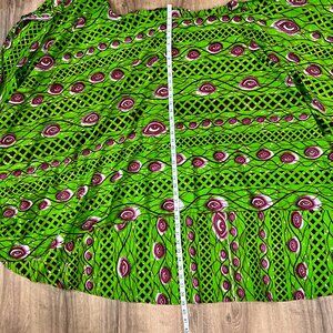 This is a gorgeous handmade item using African Wax Print fabric, also known as Ankara or Dutch Wax Print. I can't get over the vibrant green paired with the purple eye motif. This can be worn as a skirt or dress and it is one size that can accommodate so a variety of sizes. It is super long so if you are small, you simply wrap it multiple times, if you are larger there is still plenty of fabric to accommodate. There is a loop in the middle the ties can be fed through to create a dress or you can simply wrap and tie for a skirt.
