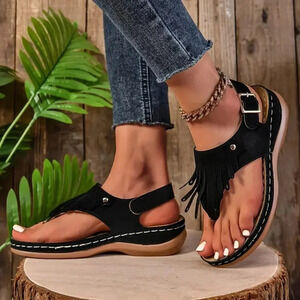 Wedge Comfort Elegant Sandals, Ankle Buckle Platform Tassel Decor Walking Shoes Vacation Thong Sandals