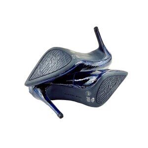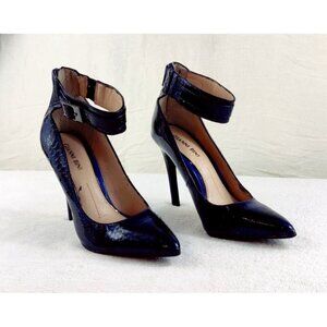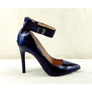 Gianni Bini ankle strap heels, in shinny navy-blue patent with an embossed snake skin pattern. Pointed toe, 4" spike heel and a faux buckle on each strap. The heels have a back zipper, for easy slip on and a padded insole. Good condition, but there is some small peeling on the inside lining.