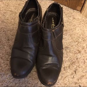Brown ankle boots that zip up and have a heel. Really cute but have been worn a lot. I loved them! There are some signs of wear on the shoes but still have life left!