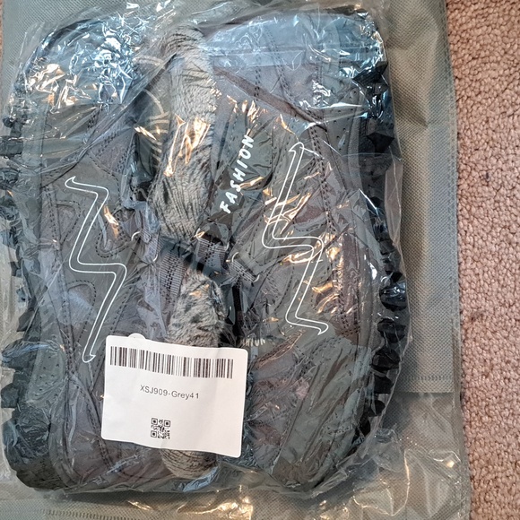 charcoal gray, grippy tread, fuzzy lining, comfy sneaker like style. never opened