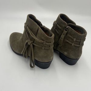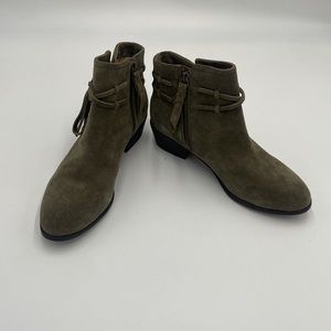 Never worn ankle high olive green suede booties with a tiny heel. Comes in original box