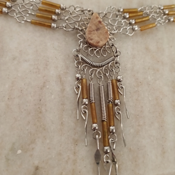 Dangle anklet with tan stone and golden brown beads set in silvertone. Pretty!