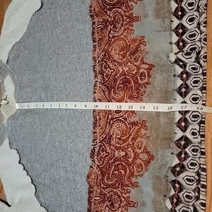 AnM gray casual long raglan sleeve shirt with sheer boho print fabric from midwaist to hem. Measures 22" underarm from seam to seam. Measures 18" from center crewneck to hem. Size Large.
