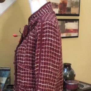 This Gorgeous Burgundy & Red Plaid Blazer Is Made Of 70% Silk & 30% Acrylic. It Has A Hint Of Some White & Black Running Through Out The Plaid Pattern.It Is Also Trimmed With Heavy Burgundy Ribbed Ribbon Edging Around The Collar, Lapel, Down Front Edge, Cuff