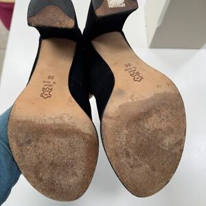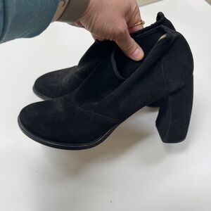 These are the coolest boots I’ve ever seen. Curved 4” heel. Suede pull on. Round toe. Size 38. Fits true to size.