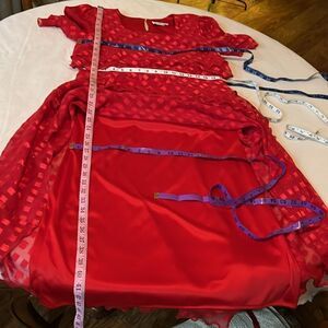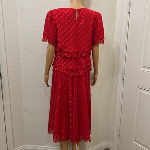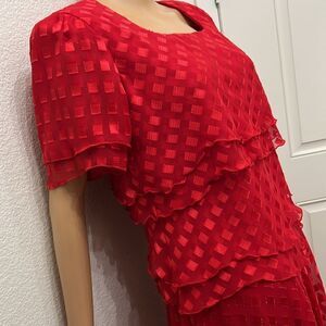 Ann Hobbs For Cattiva Dress Red Square Neck Short Sleeve Sheer Ruffle Midi Lined
