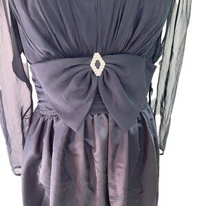 Features chiffon sleeves and bodice with a thick satin skirt and amazing bow detail in front.
